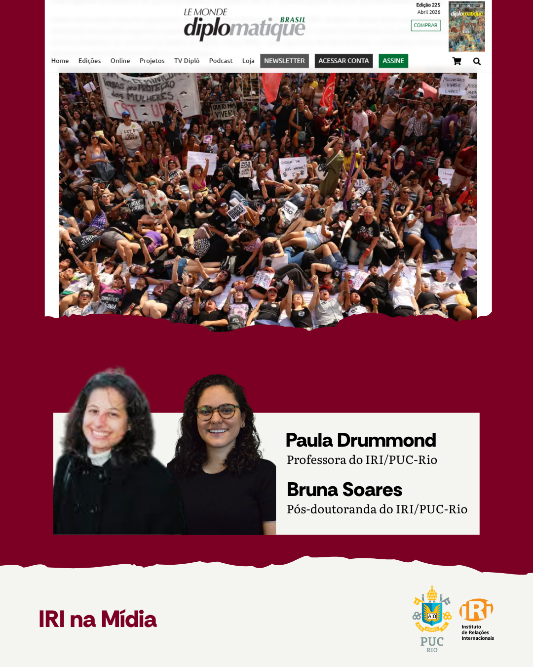 A pesquisadora do BPC PUC-Rio, Paula Drumond, e a pós-doutoranda do IRI/PUC-Rio, Bruna Soares, junto da professora Tamya Rebelo da ESPM-SP escreveram um artigo pro site Le Monde Diplomatique Brasil intitulado: “A diplomacia de gênero à brasileira”.