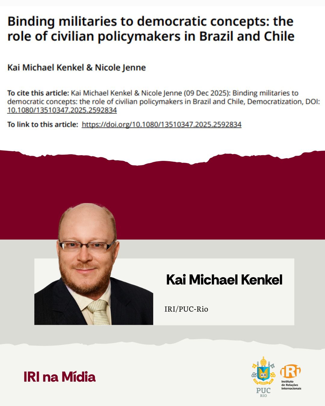 O diretor do IRI/PUC-Rio, Kai Michael Kenkel, juntamente com a pesquisadora Nicole Jenne, publicaram o artigo “Binding militaries to democratic concepts: the role of civilian policymakers in Brazil and Chile” na revista Democratization.