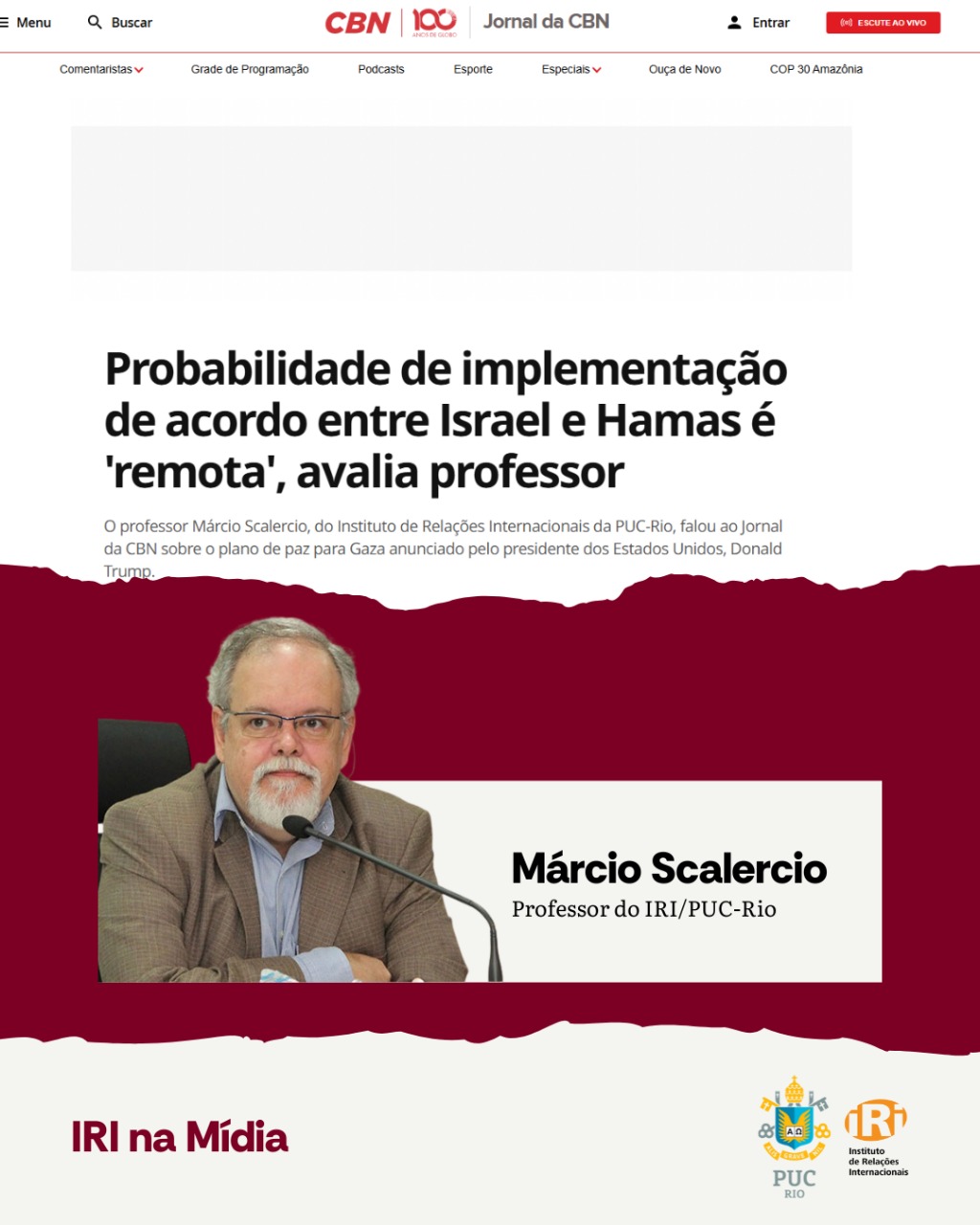 O professor do IRI/PUC-Rio Márcio Scalercio, concedeu entrevista ao Jornal da CBN sobre o plano de paz para Gaza anunciado pelo presidente dos Estados Unidos (EUA). Na entrevista, o professor explicou que a proposta, a curto prazo, é capaz de garantir a liberação dos reféns israelenses, evitar novos ataques de Israel à Gaza e permitir a chegada de ajuda humanitária.